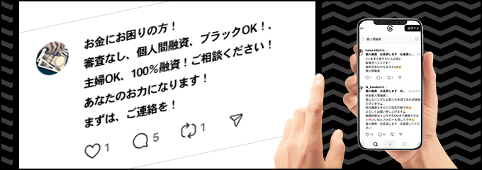 最近の闇金は、SNSを通じてごく普通の人を装って近づいてきます。「#個人間融資」などのハッシュタグで検索すると、簡単にお金を貸してくれる人が見つかるかもしれません。しかし、そのほとんどが法外な利息を要求する闇金業者です。